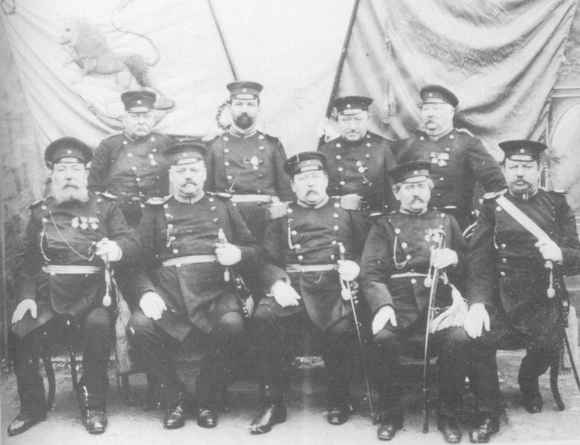 ca. 1894: Major August Henze und Adjudant Fritz Becker mit den Offizieren des Uniformierten Bürger-Schützenkorps.Leutnant des 4. Zuges war der Tischlermeister A. Teipel (hinten rechts)